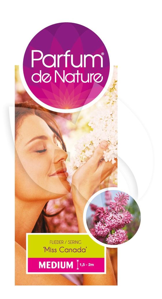 Miss Canada is tevens gekweekt behorende bij de Parfum de Nature selectie. Deze seringen zijn excellent qua geur en gekweekt op een stevige onderstam. De onderstam is vrijwel ongevoelig voor wildgroei van scheuten wat bij andere seringen nogal eens wil voorkomen. Daarnaast zorgen de, minimaal 2 jaar oude, sterke wortels voor een sterke, goed groeiende sering onder de juiste omstandigheden. De donkerroze, bijna rode bloemen geven een opvallend kleurtje aan uw tuin tijdens de bloeiperiode in mei/juni.