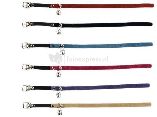 Een suede kattenhalsbandje met belletje, zodat vogels en andere kleine dieren op tijd gealarmeerd worden voor uw kat.