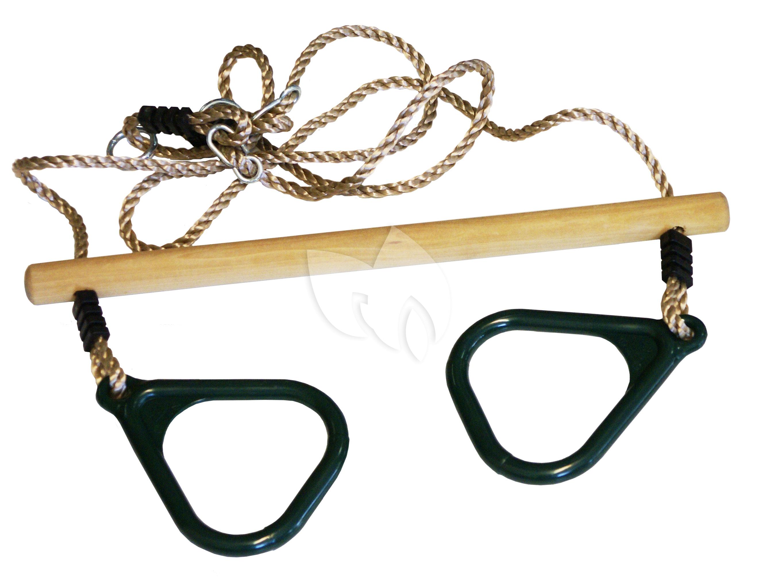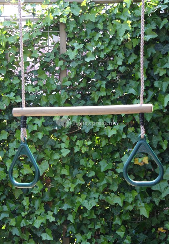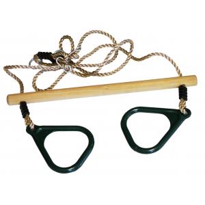 Houten trapeze met kunststof ringen. De maximale touwlengte van de schommel bedraagt 165 cm. Specificaties: