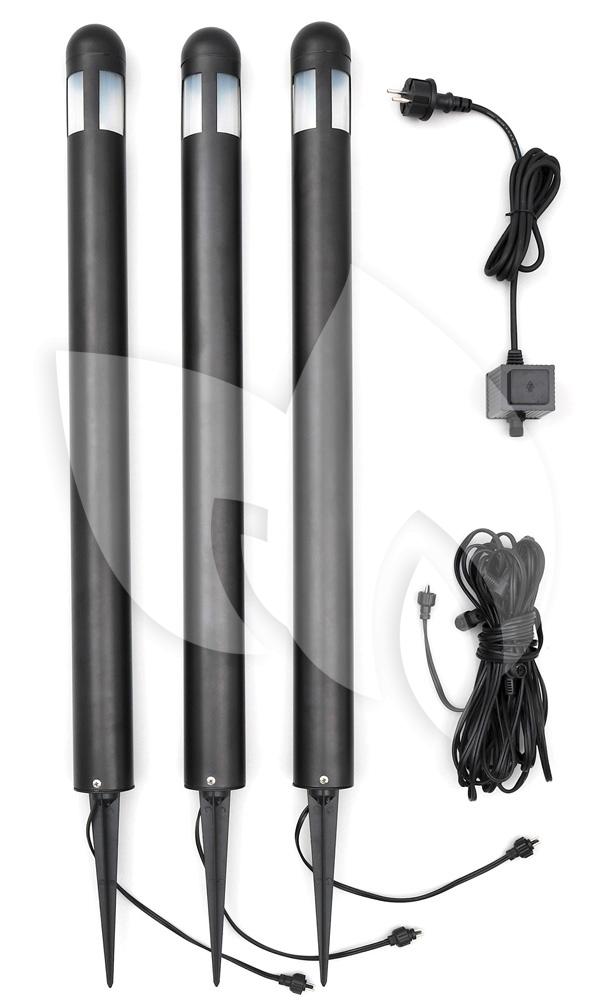 Verlicht de weg met de Amalfi vloerlampen. De Amalfi lampenset bestaat uit 375cm hoge paaltjes die u door middel van een spies in de grond kunt steken. De Amalfi halogeen set is gemaakt van matzwart gelakte aluminium. De Amalfi halogeen set bevat een transformator met een 1.9m lange aansluitsnoer en een 10m lange verlengsnoer. De Amalfi halogeen set is spatwaterdicht en heeft 2 jaar anti-corrosie garantie.