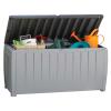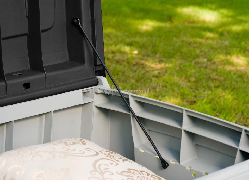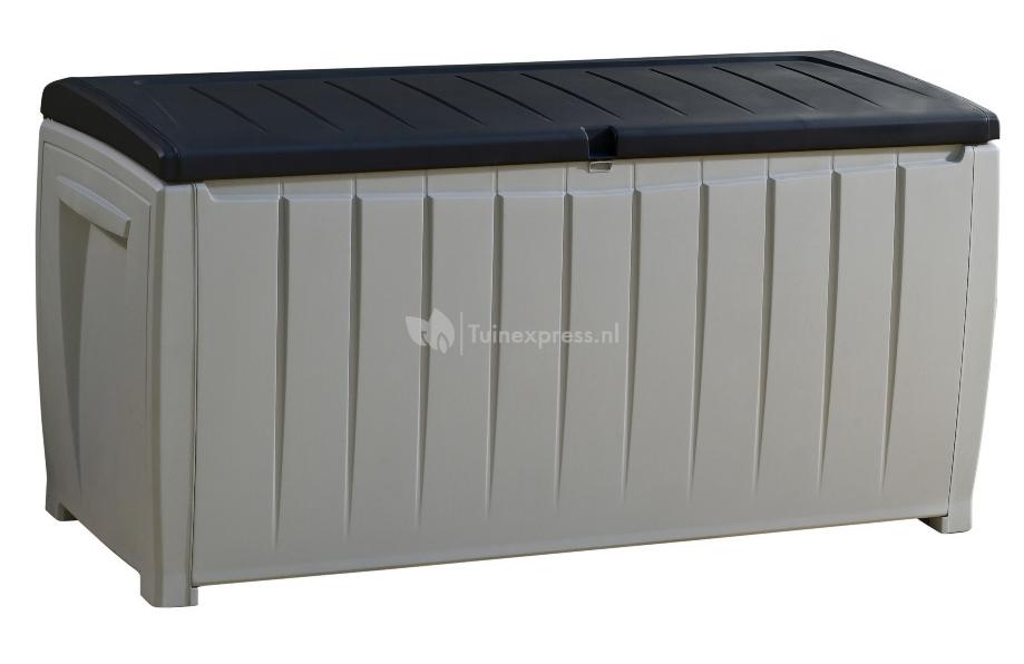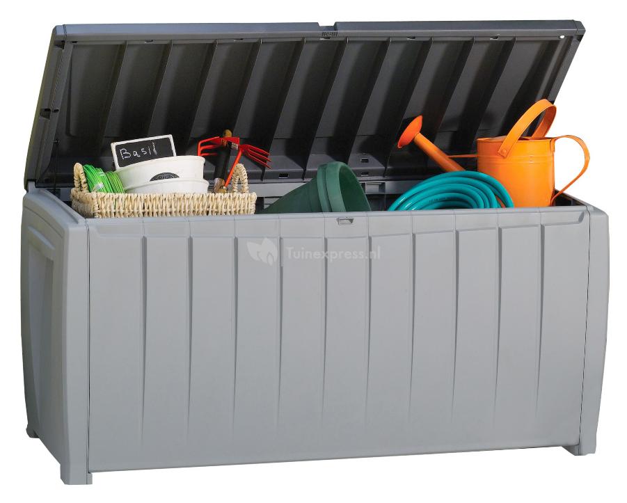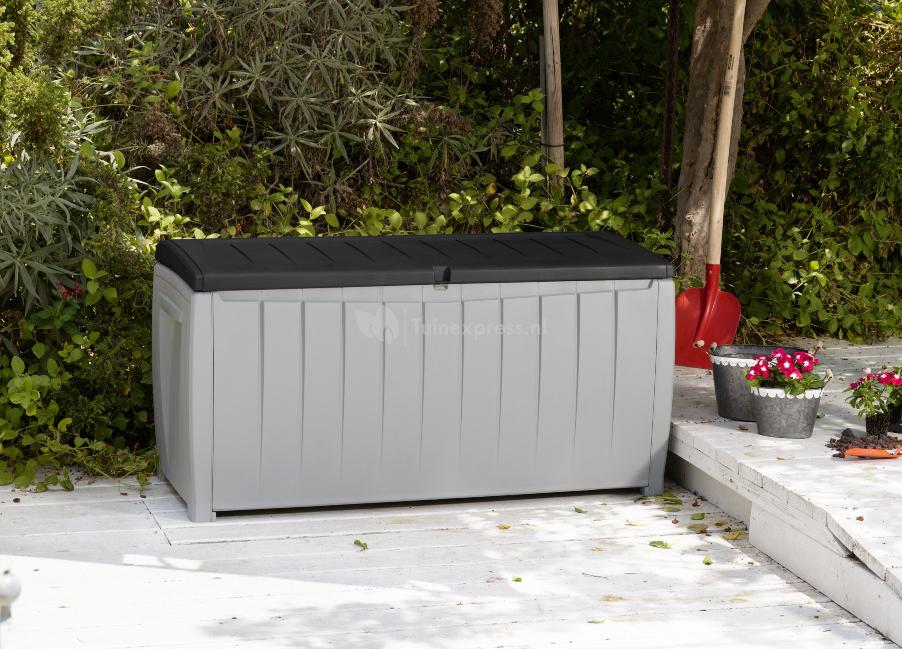 Deze kunststof opbergbox Novel is ideaal voor het opbergen van uw tuinspullen. Met een volume van 265 Liter kunt u met gemak uw tuinkussens, speelgoed of andere tuinspullen opbergen in deze opbergbox Novel. Aan de onderzijde zijn twee wielen geplaats, zo kunt u de kist ook makkelijk verplaatsen als deze gevuld is. De opbergbox heeft ook een extra stevige dekesel, zodat er 2 personen op kunnen gaan zitten.