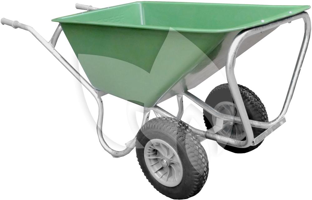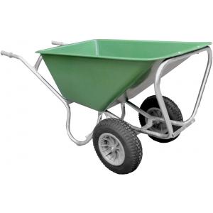 Dit type boerderij kruiwagen is zeer geschikt voor het werk in de stallen. Door het verhoogde frame en de twee banden, is de kruiwagen erg stabiel en stevig. De bak is gemaakt van stevig groen polyetheen, en heeft een volume van 160 liter. Het frame is volledig gelast en bestaat uit metalen ronde buizen. Het velg van de banden bestaat uit kunststof.