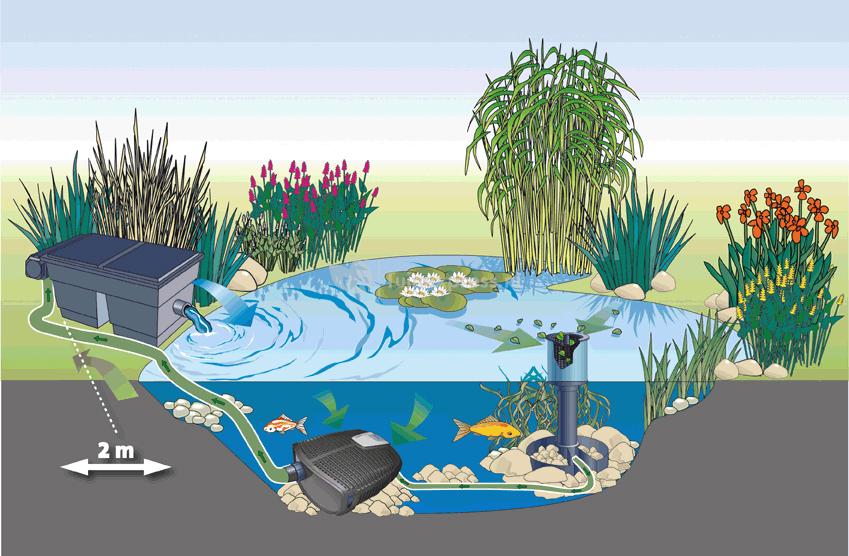 - Naast de vijverbodemfiltrering is de gelijktijdige aansluiting van een satellietfilter of skimmer mogelijk