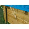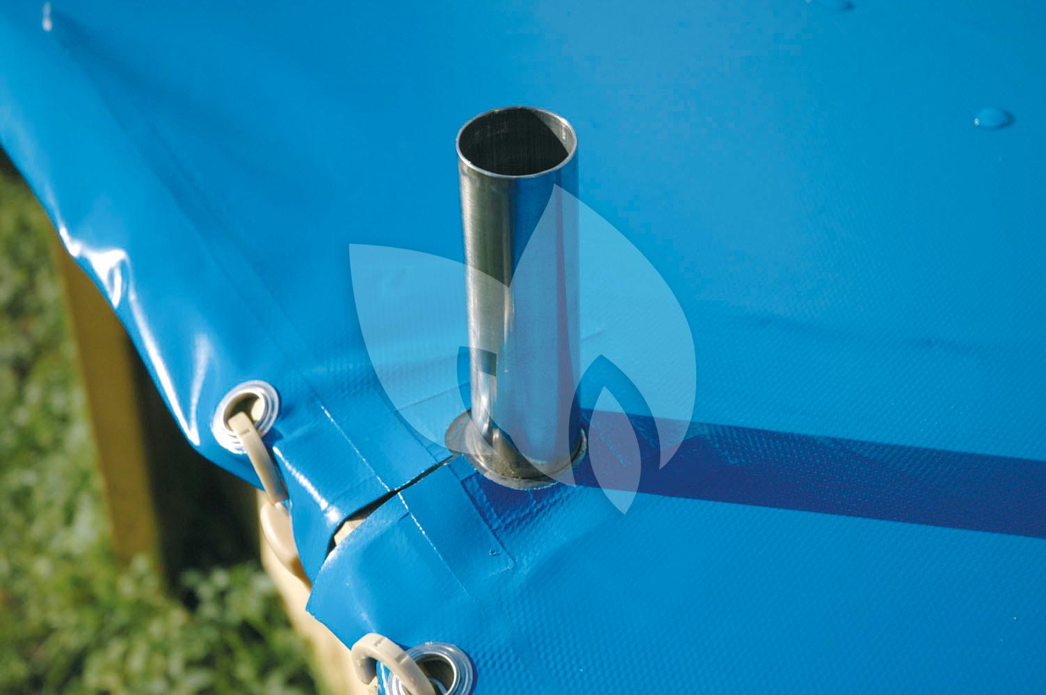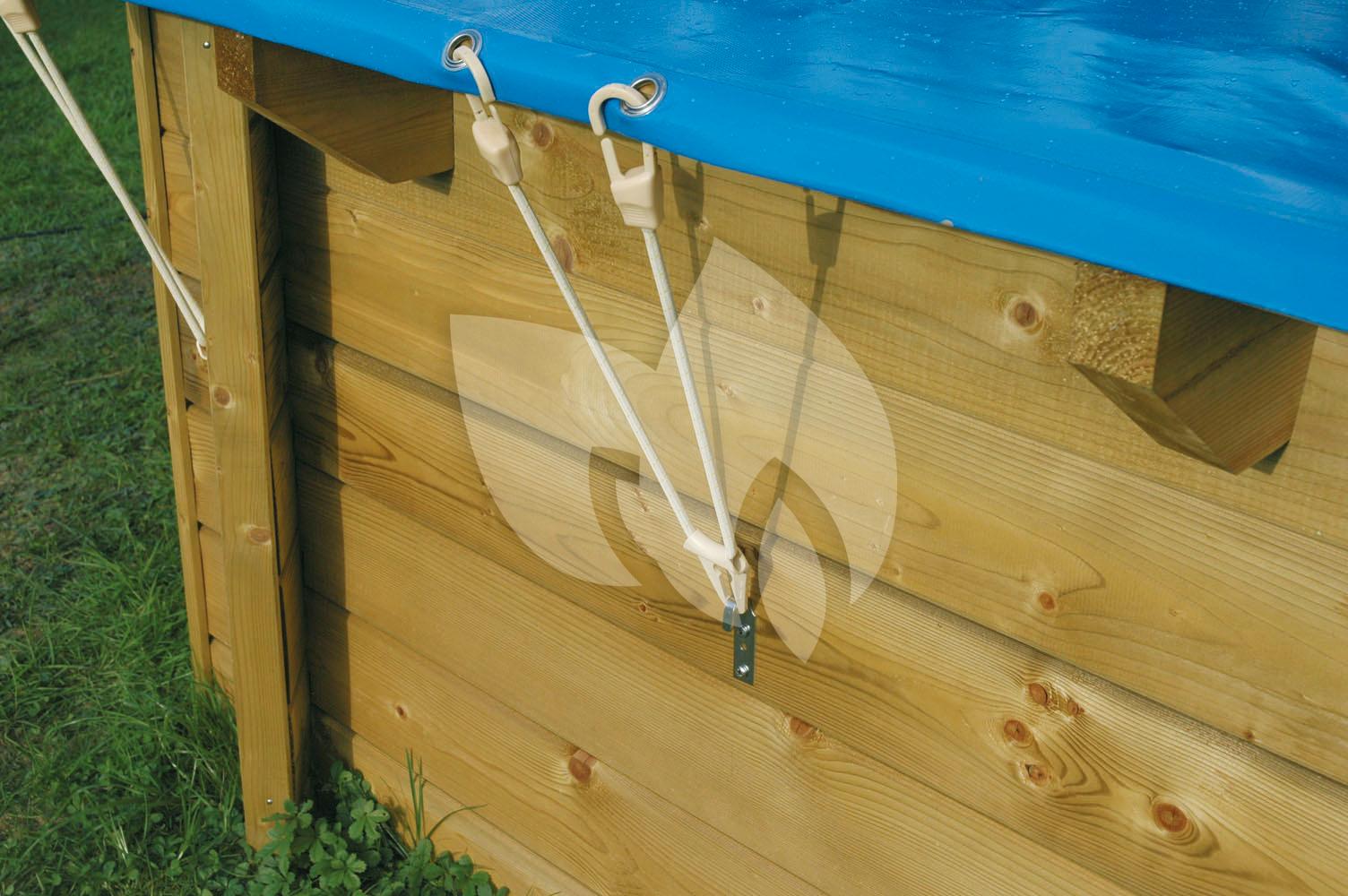 Het afdekzeil wordt als een complete set geleverd inclusief bevestigingsmateriaal, schroeven (rvs), haken, pluggen en gepatenteerde rubberen trekbanden. In de fabriek is het afdekzeil al voorzien van geponste gaten voor de trap. Bij de langgerekte types op de plaatsen aangegeven op de tekening hierboven in het rood. Het afdekzeil voor zwembad achthoekig is speciaal ontwikkeld voor de houten zwembaden van het merk Ubbink. Het type geeft namelijk niet het aantal centimeters aan van het zwembadafdekzeil.