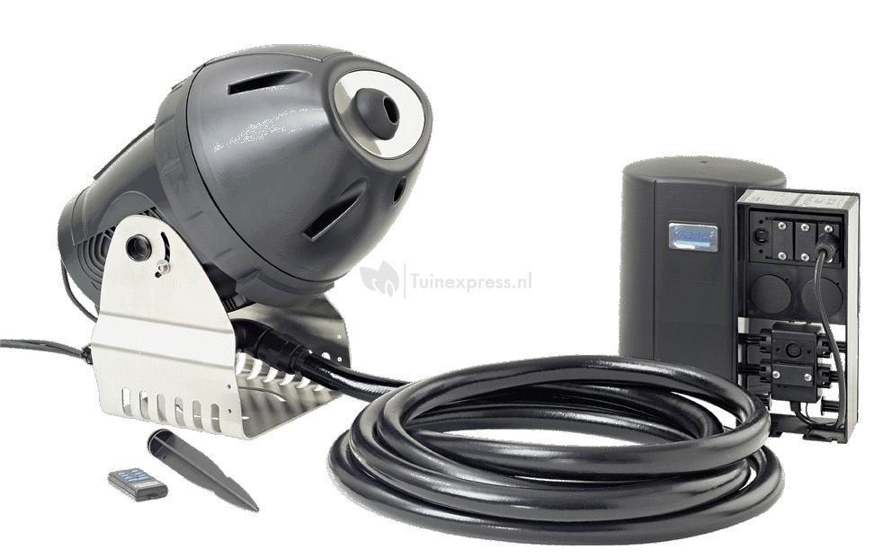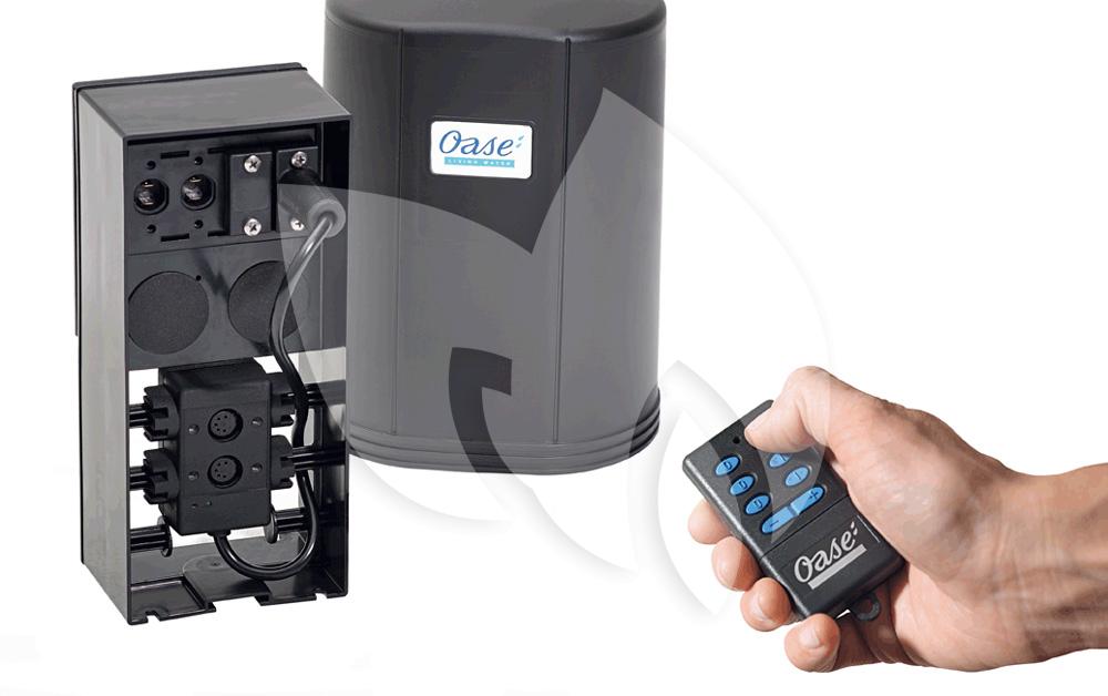 De OASE set bevat een Jumping Jet, de regeleenheid met de 12V-Master en een afstandsbediening voor de keuze van de vast ingestelde programma's, een slang en alle noodzakelijke aansluit- en regelcomponenten.