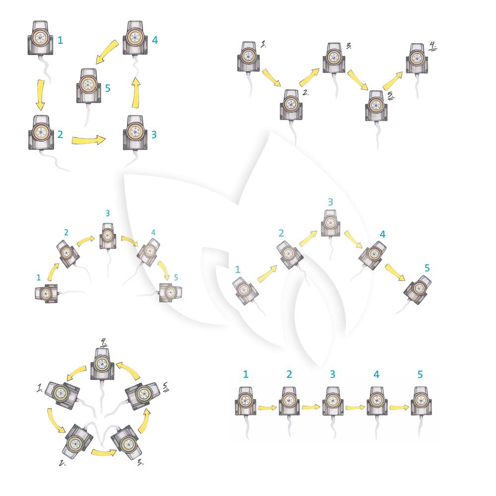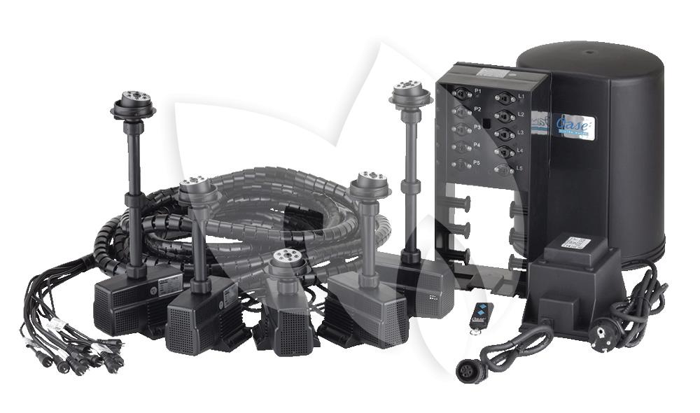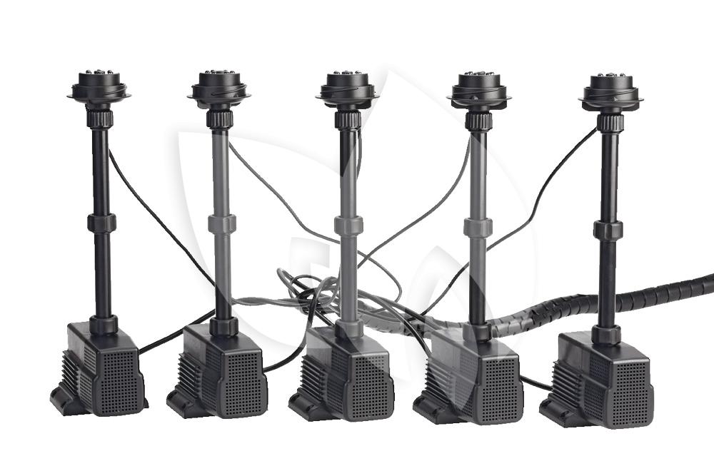 Deze nieuwe variant van de geliefde Water Quintet fontein is een echte uitdaging voor uw . De vijf afzonderlijke pompen van de water quintet creative fontein kunnen in de meest verschillende configuraties opgesteld of opgeschroefd worden. Nieuw is bovendien de optie, deze pompen aan de LED verlichtingsringen op te hangen. Hierdoor is een montage onder elk soort afdekking mogelijk en kunnen bijzonder mooie creatieve ideeën gerealiseerd worden. Ook bij deze fontein kunnen de hoogte en de snelheid via vast ingestelde programma’s geselecteerd worden – heel eenvoudig met afstandsbediening.