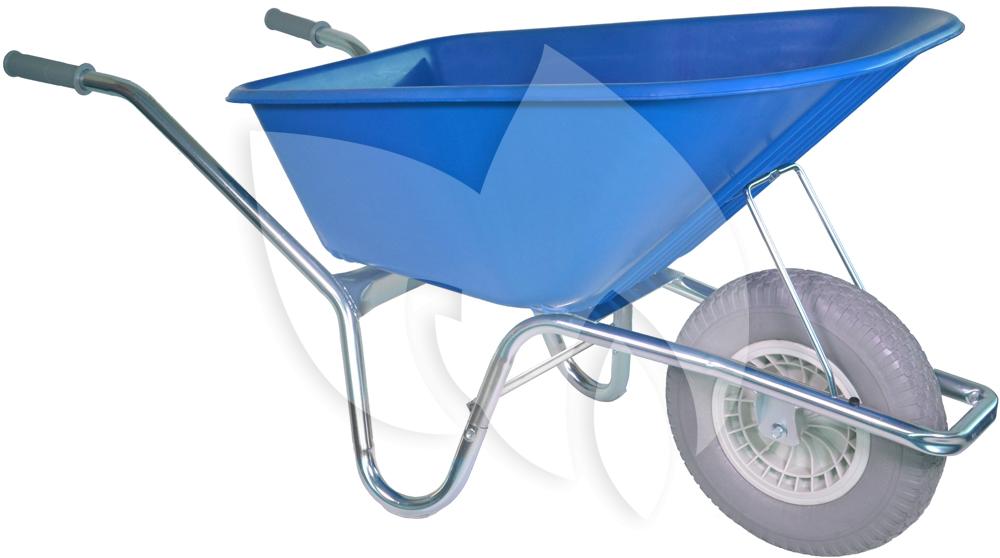 Een kruiwagen met een opvallende blauwe polypropyleen bak. Het frame is erg stevig en gemaakt van metaal. Het frame is afgewerkt met een laag zink, dat het frame intact houdt, ook bij slecht weer. De inhoud van de bak is 100 liter, hierdoor kunt u veel spullen tegelijk vervoeren.