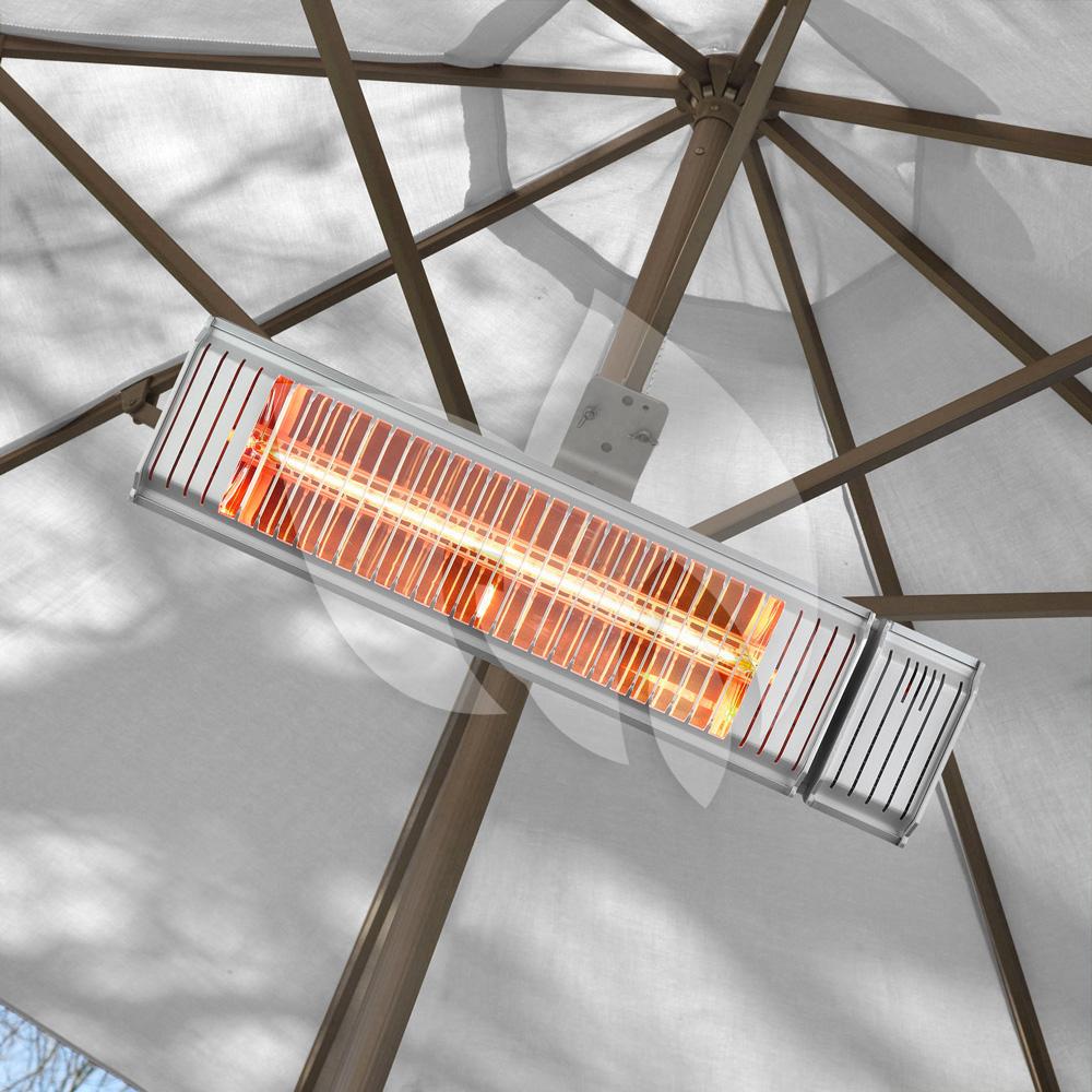 Dankzij de infraroodstraling van de Golden 2000 Amber Smart wordt in eerste instantie niet de lucht in de omgeving opgewarmd, maar juist de personen die in het bereik van de lamp zitten. Binnen no time heeft u het heerlijk warm! De terrasverwarmer is voorzien van een speciale Golden Amber ULG lamp, die 90% minder licht produceert. De Golden Amber UCL lamp verspreidt veel warmte en heeft een natuurlijke, warme, zachtgele gloed. De terrasverwarmer is verticaal 100º draaibaar, zo kunt u hem in de juiste hoek plaatsen en de warmte gericht afstemmen. De terrasverwarmer kan een oppervlakte van maximaal 22m² opwarmen en is volledig stof- en spuitwaterdicht waardoor u hem het hele jaar door buiten kunt laten hangen.