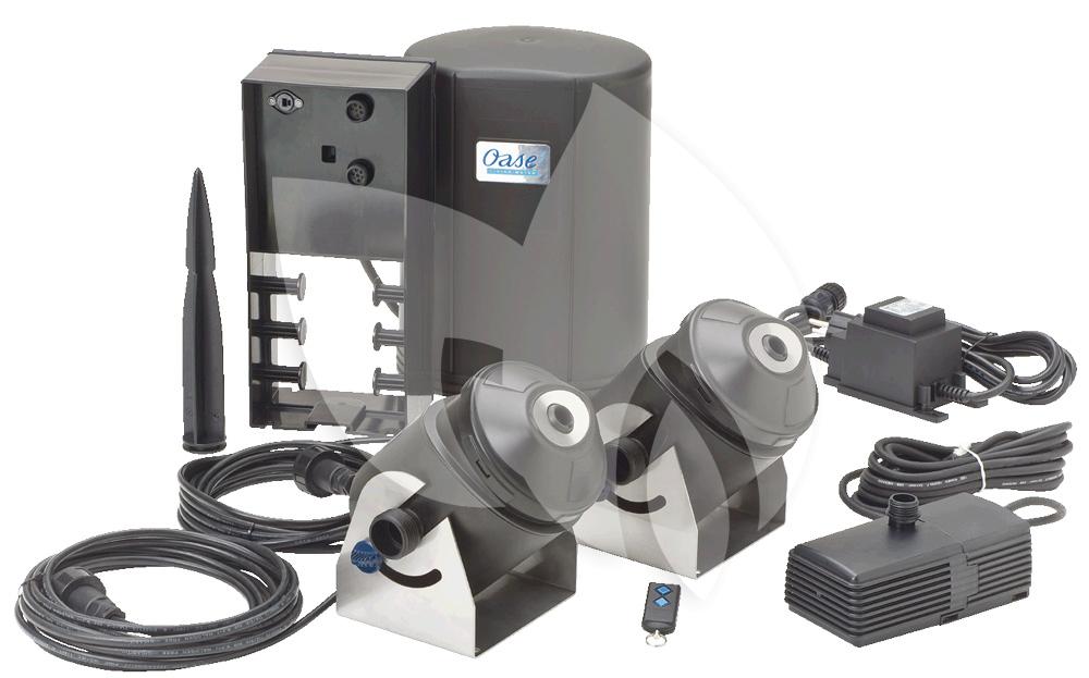 Regenboog in dubbele uitvoering. De kleine uitvoering van de Jumping Jet Rainbow Star fontein is als set van 2 stuks verkrijgbaar en wel in het bekende attractieve design. De geïntegreerde LED lamp geeft alle RGB kleuren in de waterstraal in een vloeiende overgang weer – en is naar wens ook in één kleur verlicht. Verschillende, vast ingestelde programma’s kunnen met een afstandsbediening geselecteerd worden en zijn verschillend van straalwijdte of van wit of afwisselend gekleurd licht. De inbouwmogelijkheden zijn ook hier heel veelzijdig: De hoogwaardige rvs standvoet kan op verschillende ondergronden vastgeschroefd worden, zorgt ervoor dat het apparaat niet omvalt en heeft een instelbare hoek. De complete set omvat twee keer de Water Jet Lightning fontein incl. energie-efficiënte pomp, regeleenheid en transformator, slang en afstandsbediening. De gehele set is met een vermogensopname van 40 W bijzonder energie-efficiënt. Door het OASE »Plug’n’Spray« concept is de Water Jet Lightning fontein meteen klaar voor gebruik – dus gemakkelijk te installeren.