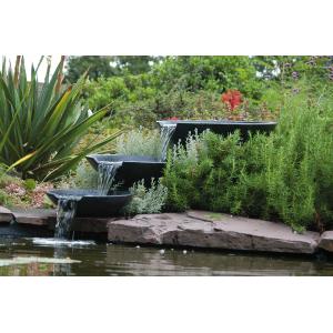 Het waterornament Nova Scotia is een set bestaande uit 3 watervalschalen. De schalen zijn gemaakt van het lichte materiaal terrazzo in een antraciete kleur. Dankzij zijn hoogwaardige kwaliteit heeft het ornament een lange levensduur verkregen. De schalen zijn verschillend van grootte en ieder voorzien van een uitsparing. Wanneer u de schalen boven elkaar plaatst zal er een waterval ontstaan, waarbij u kunt kiezen om de waterval te laten uitmonden in uw vijver of in een opvangbassin (deze wordt niet meegeleverd). De Nova Scotia wordt geleverd met een bijpassende pomp en aansluitmateriaal waardoor hij zeer eenvoudig is te monteren en te plaatsen.