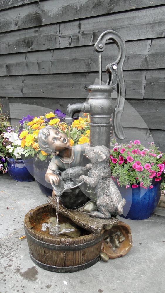 Hoe schattig is dit waterornament ''jongen en de hond bij de pomp''! De jongen en de hond drinken als het ware samen van het water dat uit de zwengelpomp komt. Dit decoratief waterornament is voorzien van de meest prachtige details en zal uw tuin of terras meteen opvrolijken!