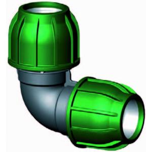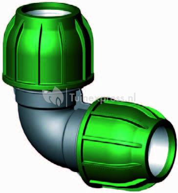 Buiskoppeling voor gebruik met HDPE beregeningsslang. Knie voor het maken van een 90 graden bocht in de kunststof waterleiding. Eenvoudig te monteren doordat de buiskoppeling is voorzien van knelkoppelingen.