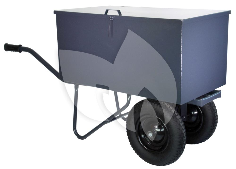 Een erg handige gereedschap kruiwagen, met een zeer ruime gereedschapsbak. De gereedschapsbak bestaat uit de afmetingen 90x50x43, dit geeft u genoeg opberg ruimte voor al uw gereedschap. De bak is gemaakt van gecoat staal en is grijs gekleurd. Het frame bestaat uit ovale grijze buizen. De deksel van de gereedschapsbak heeft een gasveer, hierdoor hoeft u niet de klep open te houden als hij eenmaal openstaat. Door het gebruik van twee wielen is de kruiwagen nog stabieler.