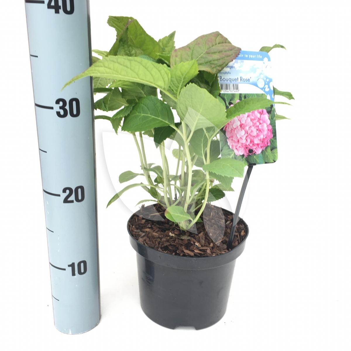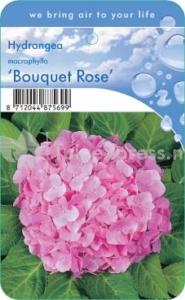 De tuinhortensia Bouquet Rose bloeit van juli tot en met september met meestal lichtroze maar soms blauwe bollen bloemen. De kleur is afhankelijk van de zuurtegraad van de grond. Bouquet Rose maakt grote bollen bloemen aan die soms te zwaar zijn voor de stelen, de bloembollen buigen hierdoor wat af. In een verhoogd border geeft dit een prachtig effect. Deze hortensia, behorende tot de oudere soorten bloeit ook gedeeltelijk op nieuw hout, opvallend want hier worden vooral nieuwe soorten op gekweekt.