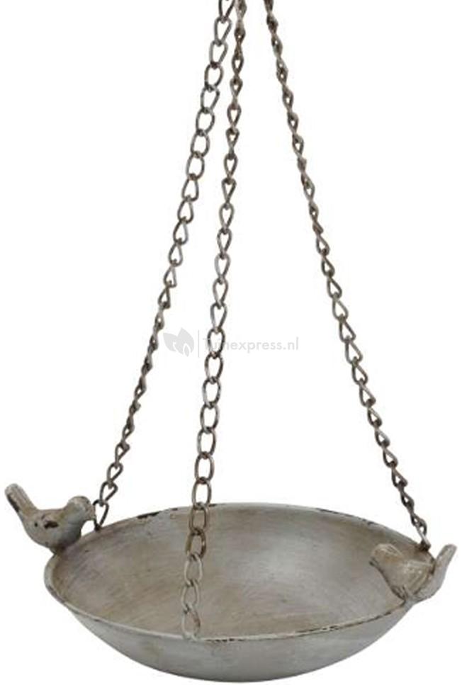Deze aan een ketting hangende metalen vogelbak hang je eenvoudig op in een boom zodat vogels extra beschermd zijn tegen roofdieren en ongestoord kunnen badderen. Je creëert een veilige bad- en drinkplaats voor de vogeltjes in je tuin. Daarnaast geven de decoratieve vogeltjes op de rand van de bak ook een extra veilig gevoel aan de badderende vogeltjes.