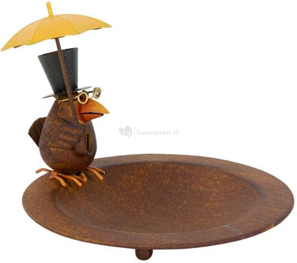 Origineel roestbruin metalen vogelbad met zeer grappige vogel op de rand van het bad. Dit decoratieve vogeltje draagt een hoge hoed, brilletje en paraplu. Leuk en gedetailleerd. Dit vogelbad is tevens goed voor 4-seizoenen, je gebruikt het als verkoelend bad in de warme maanden en tijdens de koude winterperiode kun je de schaal vullen met vogelvoer. Plaats het bad op een zichtbare, toch beschutte plek in de tuin.