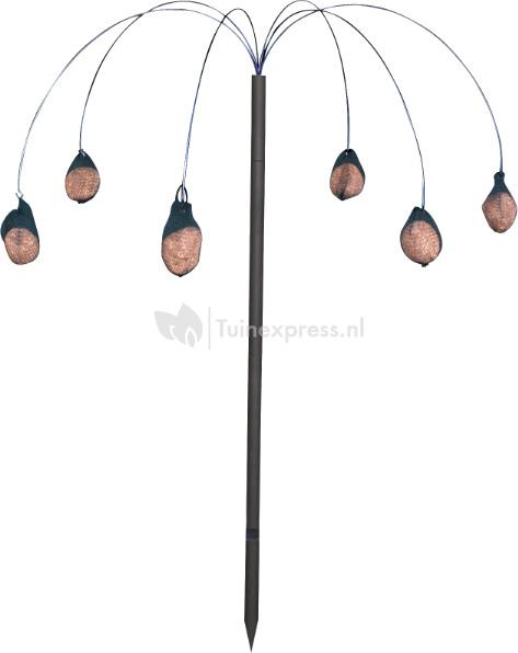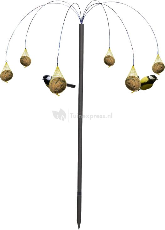Het vogelvoedersysteem heeft een simpel, trendy maar efficiënt design. Het systeem is gemaakt van gepoedercoat metaal en beschikt over 6 bogen waaraan u vetbollen kunt hangen. Door de toegespitste punt aan de onderkant kunt u de palmfeeder gemakkelijk in het gras of zand steken.
