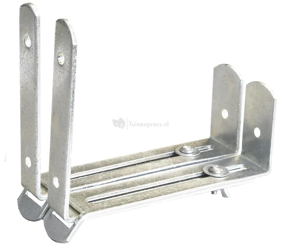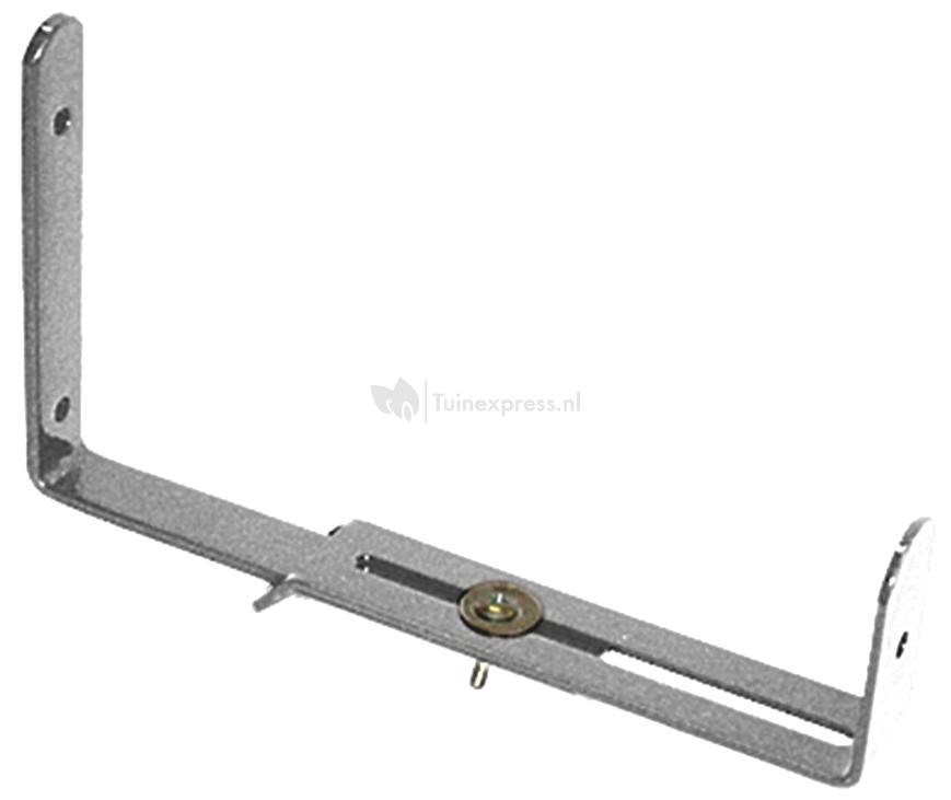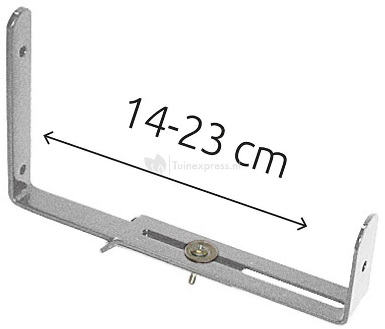 Verzinkt metalen set wandbeugels om balkonbakken mee op te hangen aan een muur, hek of schutting. De diepte van de beugel is op de diepte van de balkonbak aan te passen.