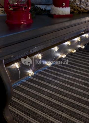Het lichtsnoer is voorzien van 24 ballen die zijn omringd met goudkleurige metaaldraad. In iedere bal bevindt zich een LED-lampje die zorgt voor een sfeervol warm, wit licht. De kabel van het lichtsnoer is transparant waardoor alleen de verlichte metaalballen op zullen vallen in uw gedecoreerde kerstboom, in uw versierde vaas of op uw feestelijk gedekte tafel. Het lichtsnoer werkt op batterijen en is daardoor gemakkelijk in gebruik en te verplaatsen. Batterijen worden niet meegeleverd.