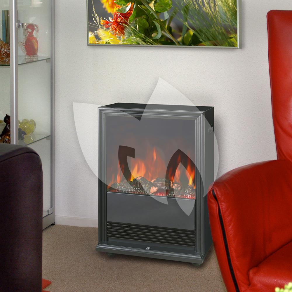 De openhaard plaatst u eenvoudig tegen de muur en is door zwenkwieltjes en handgrepen makkelijk te verplaatsen. Dankzij de oververhittingsbeveiliging schakelt de kachel automatisch uit wanneer hij inwendig te heet wordt.