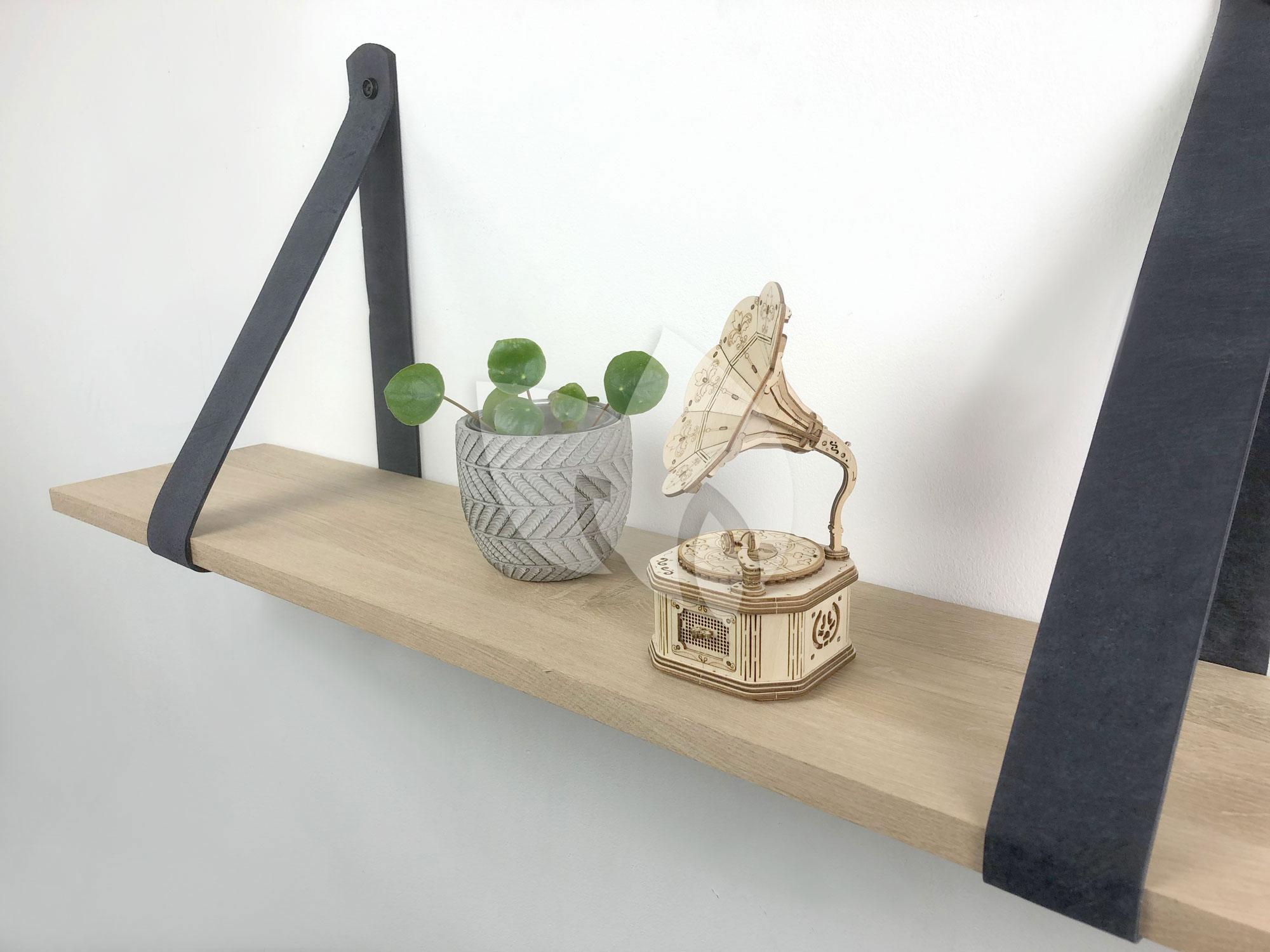 Eiken 18mm wandplank recht 60 x 20 cm inclusief leren riemen grijs