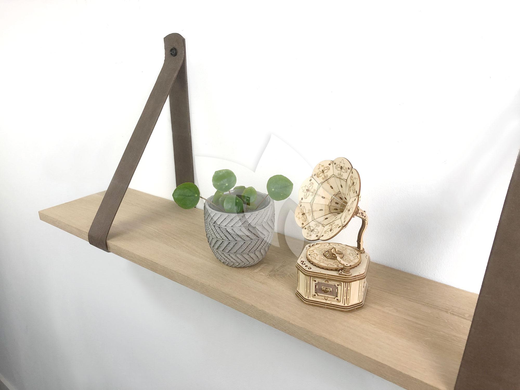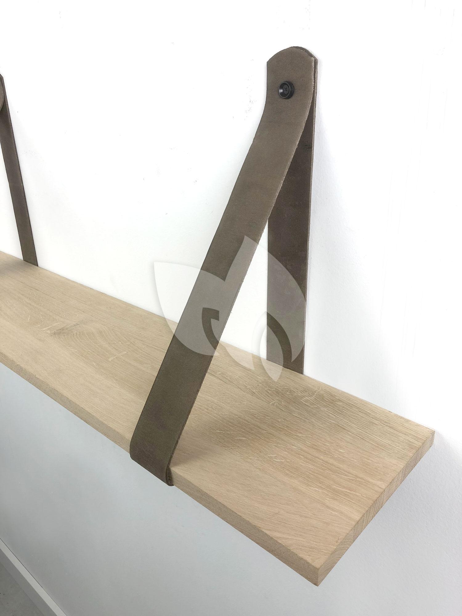 Eiken 18mm wandplank recht 75 x 20 cm inclusief leren riemen bruin