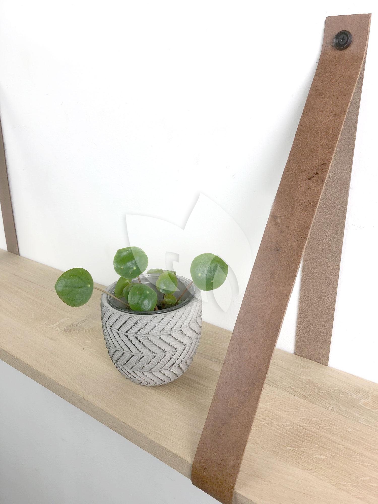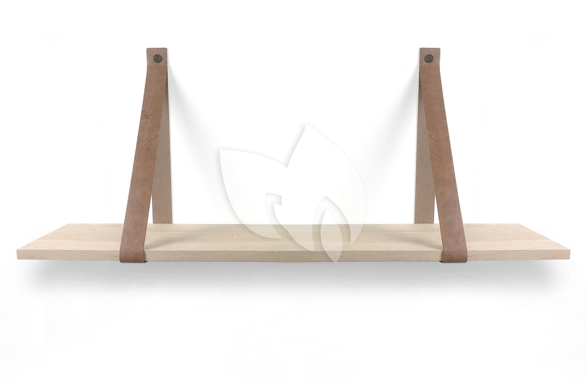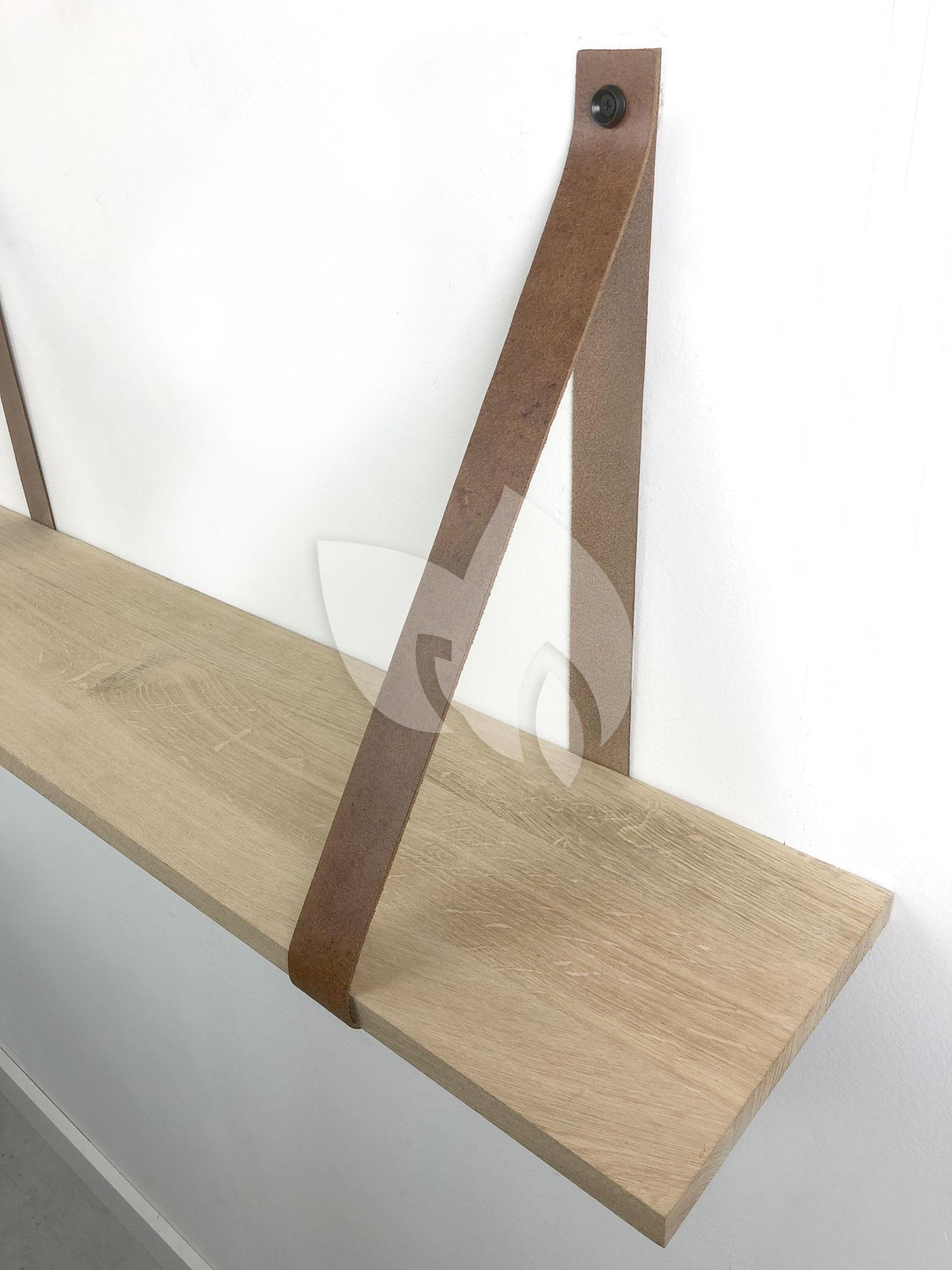 Eiken 18mm wandplank recht 80 x 20 cm inclusief leren riemen cognac