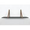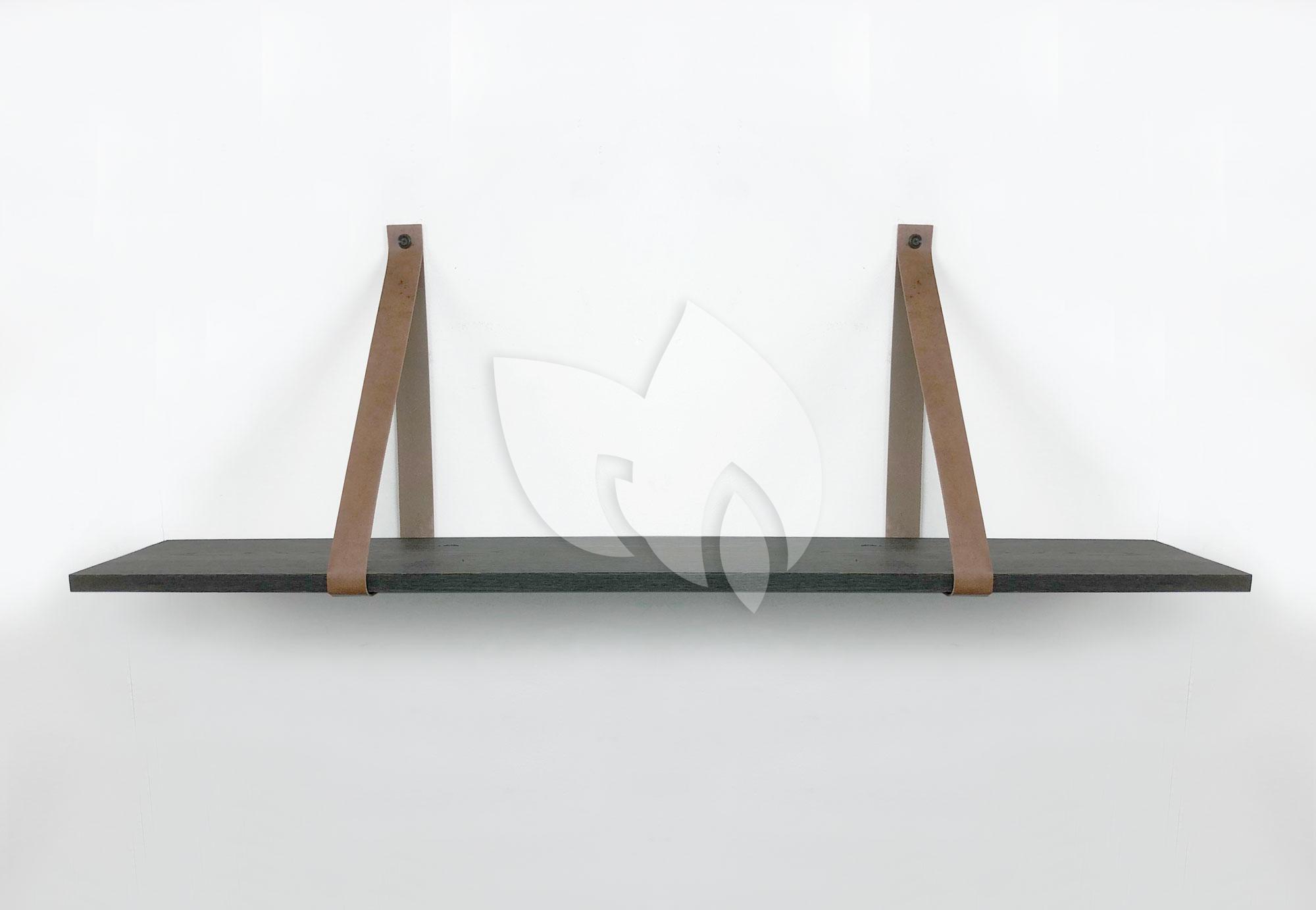 Eiken 18mm wandplank recht zwart 60 x 20 cm inclusief leren riemen cognac