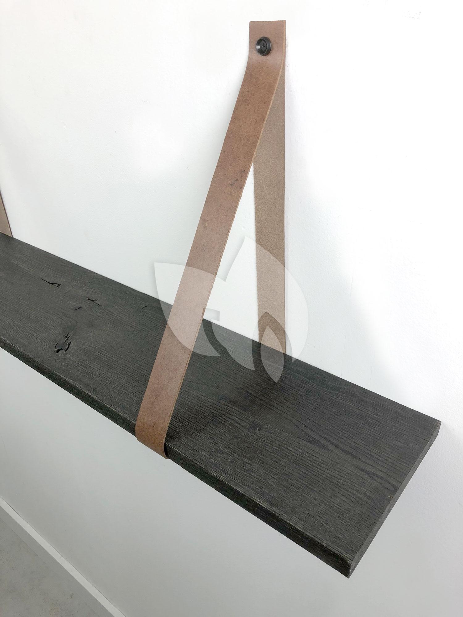 Eiken 18mm wandplank recht zwart 80 x 20 cm inclusief leren riemen cognac