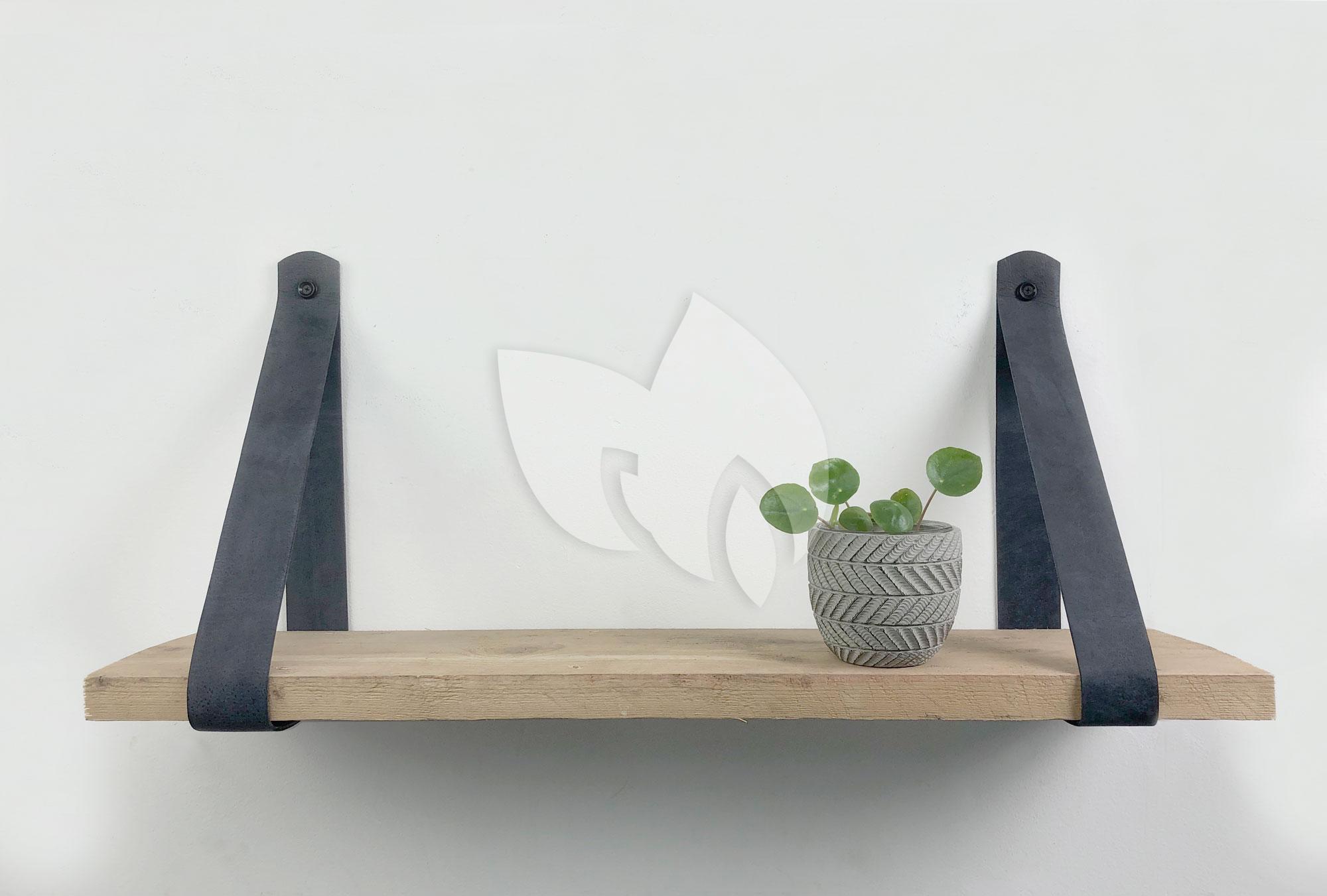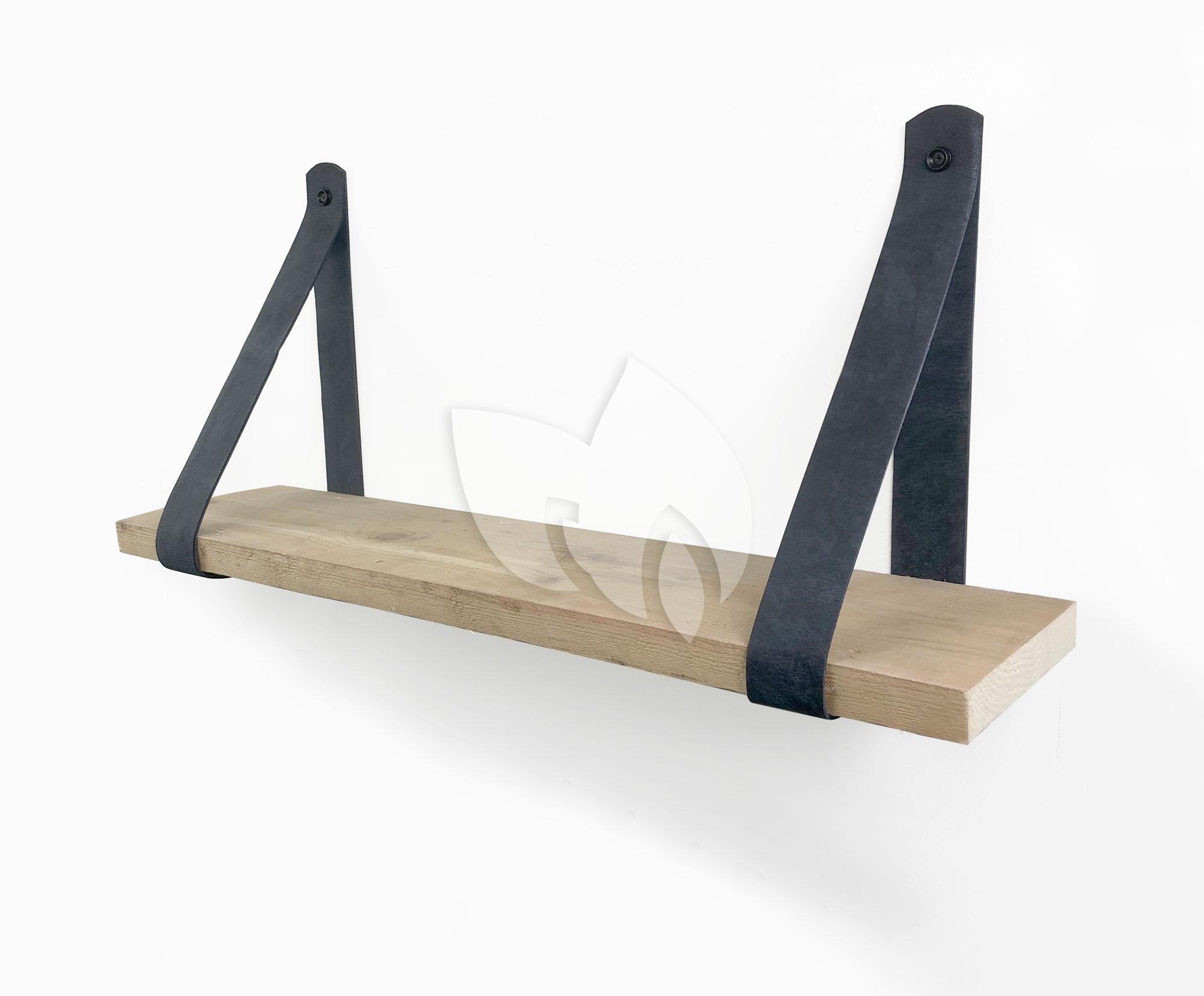 Steigerhout wandplank gebruikt 60 x 20 cm inclusief leren riemen antraciet