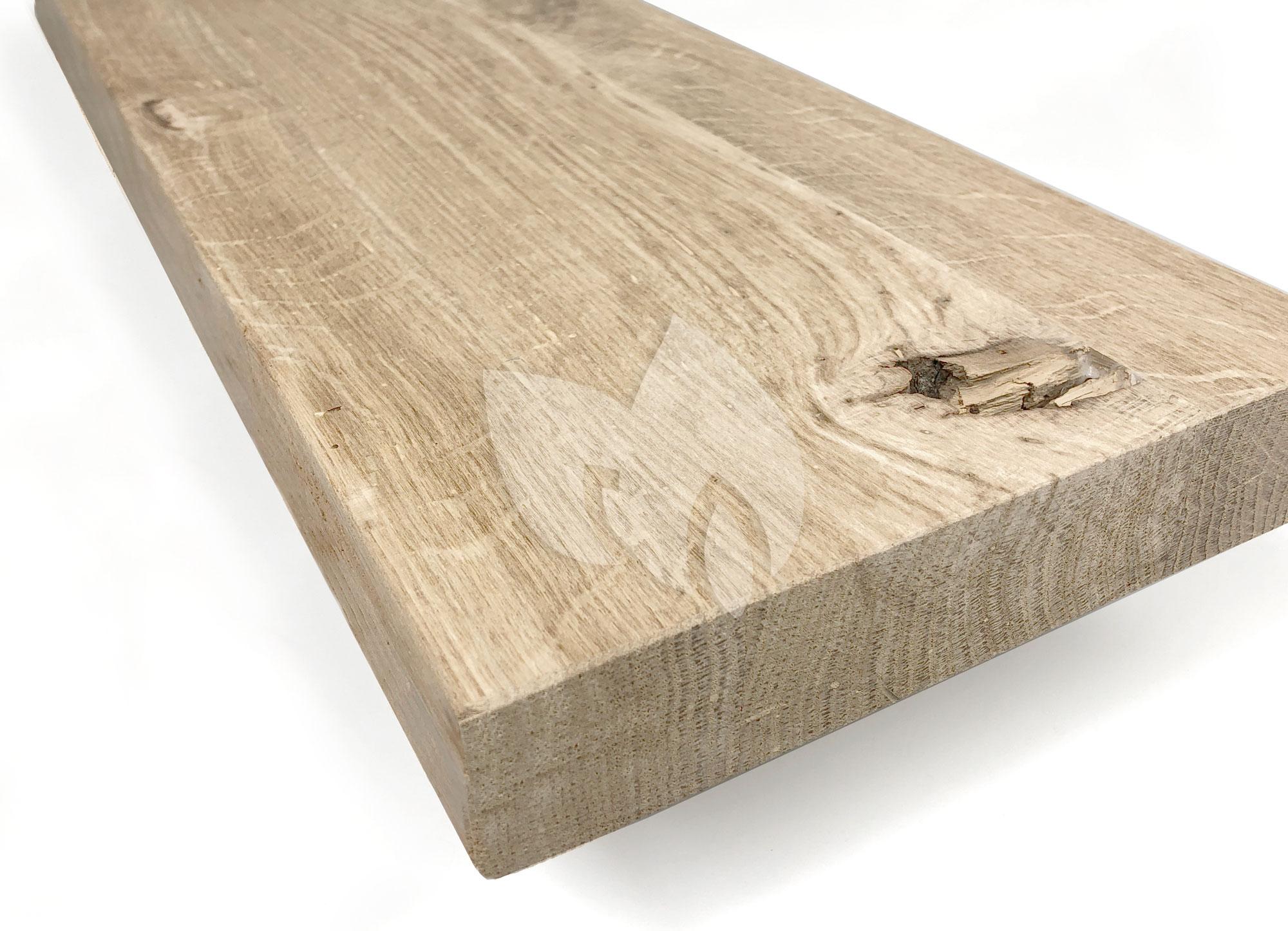 Deze eikenhouten plank van oud hout met recht afgezaagd vooraanzicht past bij iedere woonstijl. Oud eikenhout vertoont meer groeven dan massief eiken, het is een geleefde plank. Dit hout krijgt een nieuw leven door het te gebruiken voor de zwevende wandplank van oud eiken. Oud eiken heeft een karakteristieke uitstraling met hier en daar wat meer scheurvorming of de afdruk van knoesten.