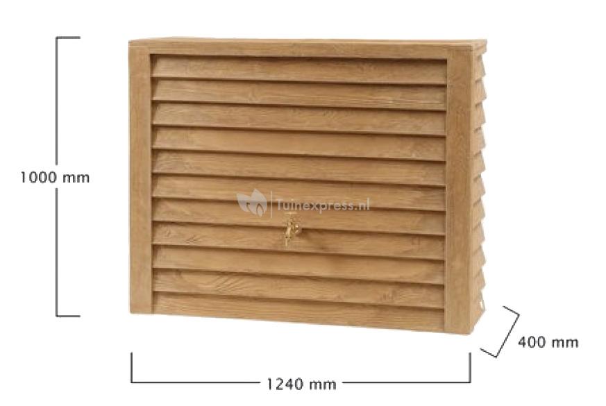 De stijlvolle regenton Woody is gemaakt van kunststof met een realistisch lichtbruin houtstructuur. De regenton heeft een inhoud van maar liefst 350 liter, is aan beide zijkanten voorzien van tapopeningen en is vorst- en weersbestendig. Het opgevangen regenwater kunt u doormiddel van de bijgeleverde messing kraan eenvoudig uit de regenton tappen. De Woody regenton is ook verkrijgbaar in de kleur donkerbruin.