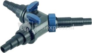 Waterverdeler met 1 ingang en 2 uitgangen. Beide uitgangen individueel regelbaar. Niet geschikt voor droge opstellingen
