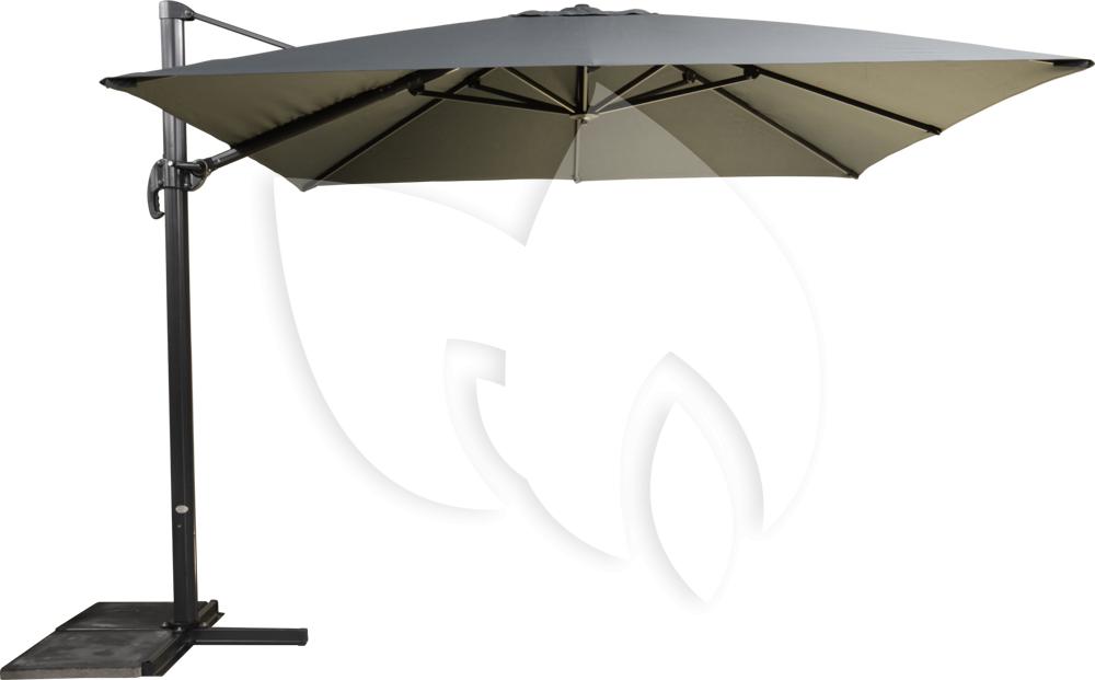 De zweefparasol dient geplaatst te worden op een passende parasolvoet, deze wordt niet meegeleverd. Een kruisvoet in combinatie met het aluminium frame en de acht aluminium baleinen van de parasol maakt het geheel zeer stabiel en robuust. De voetflens van de parasol is 360 graden draaibaar zodat u op ieder gewenste plaats schaduw kunt creëren.